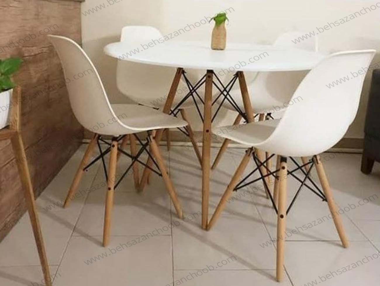 میز ناهارخوری پایه ایفلی چهار نفره E899 این میز برای چهار نفره و صفحه آن جنس ام دی اف روکشدار دارد که قابل شستشو میباشد تمام پایه ها جنس فلزی دارد و بصورت پیچ و مهره بهم اتصال پیدا میکنه رنگ صفحه و نشیمن صندلی ها سفید رنگ هستند برای آشپزخانه، محل کار و برای بالکن و ویلا ها بسیار وسیله مناسبی میباشد این میز برای شش نفره هم تولید میگردد دارای رنگبندی سفید، مشکی و قهوه ای میباشد